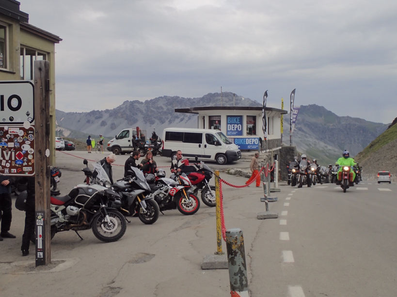 Plans will have to be flexible today because of the weather forecast. . Nevertheless we start by going over a pass named, very oddly, after a sewing machine. No , it was not the Singer Pass or even worse the Suzuki pass but rather the Bernina pass. The temp drops to 10 degrees as we go over the pass. But the rain stops, the road becomes dry and the corners become beautiful to ride.